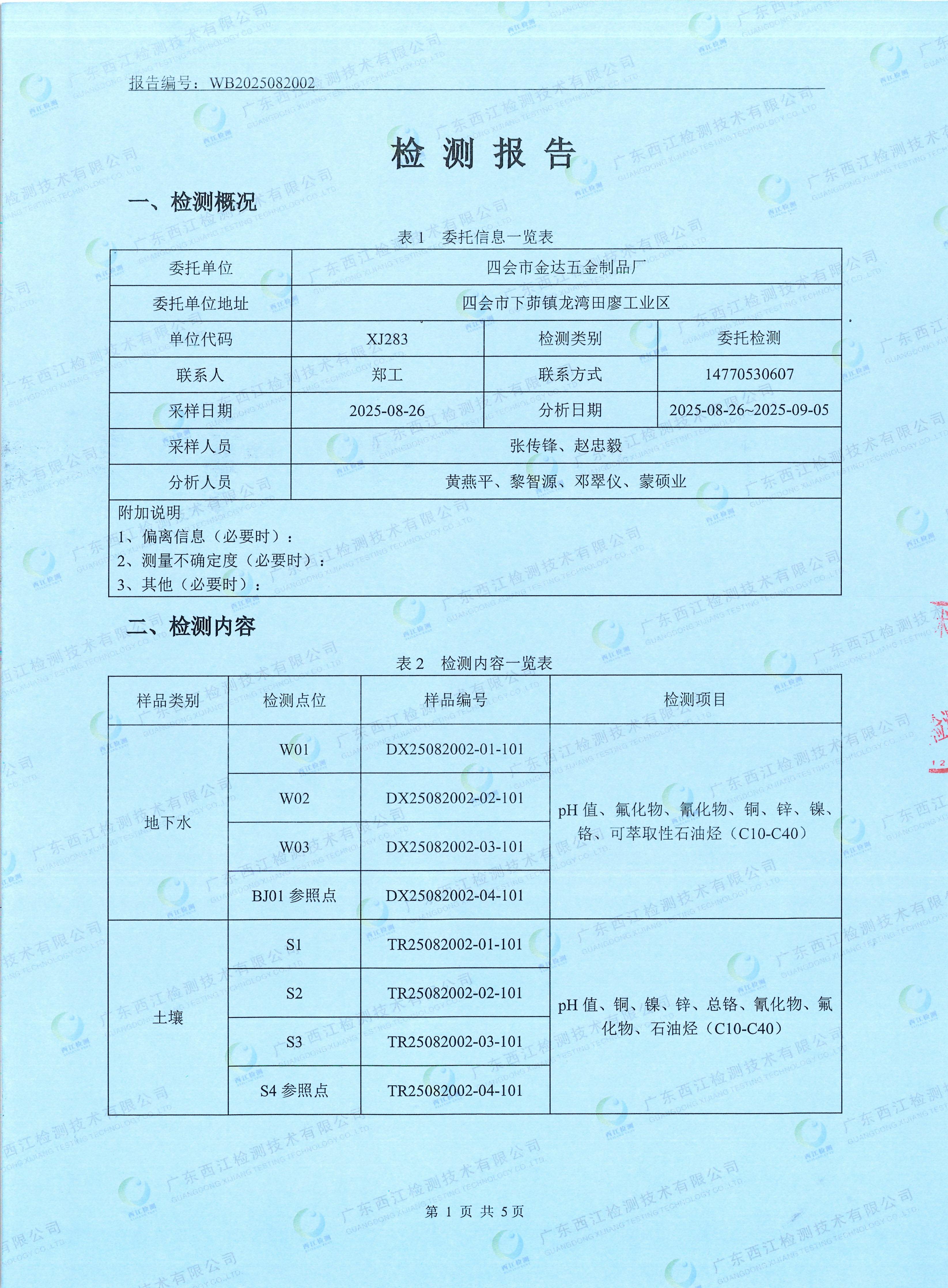 2025四會(huì)市金達(dá)五金制品廠地下水、土壤檢測(cè)報(bào)告