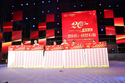 當(dāng)天晚會(huì),為弘揚(yáng)慈善精神,感謝各位服務(wù)中心老板、供應(yīng)商朋友們對(duì)金達(dá)公司二十周年慶典活動(dòng)的大力贊助,經(jīng)金達(dá)公司董事會(huì)的決定,將本次活動(dòng)所籌集的全部贊助金(135萬元),另廣東金達(dá)公司贊助金100萬元,合計(jì)235萬元全部將用于成立“廣東金達(dá)慈善事業(yè)基金會(huì)”。此外,廣東金達(dá)公司還決定每年捐贈(zèng)500000元廣東金達(dá)慈善事業(yè)基金會(huì),主要用于幫扶公司有困難的服務(wù)中心客戶、供應(yīng)商、公司內(nèi)部困難職工。