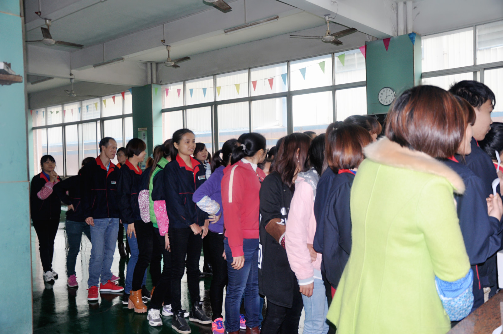 在食堂,排起了兩條長龍,擁擠卻井然有序。