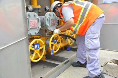 20分鐘后,然氣搶險隊及時趕到現(xiàn)場,立即進行一系列搶修工作。拉起警戒線,架起吹風(fēng)機,穿戴防毒面罩,主要技術(shù)人員立即到泄漏點了解泄漏原因。但由于此時,現(xiàn)場天然氣濃度不斷升高,潛在爆炸危險,而且然氣靠近作業(yè)區(qū),機器仍在運行當(dāng)中。然而搶險人員處變不驚,一邊迅速從然氣總閥進行引流,將泄漏煤氣從安全管道排出,降低車間然氣濃度,在空曠位置燃燒揮發(fā);另一邊則進行泄漏點維修,及時堵塞泄漏點,制止事故發(fā)生。